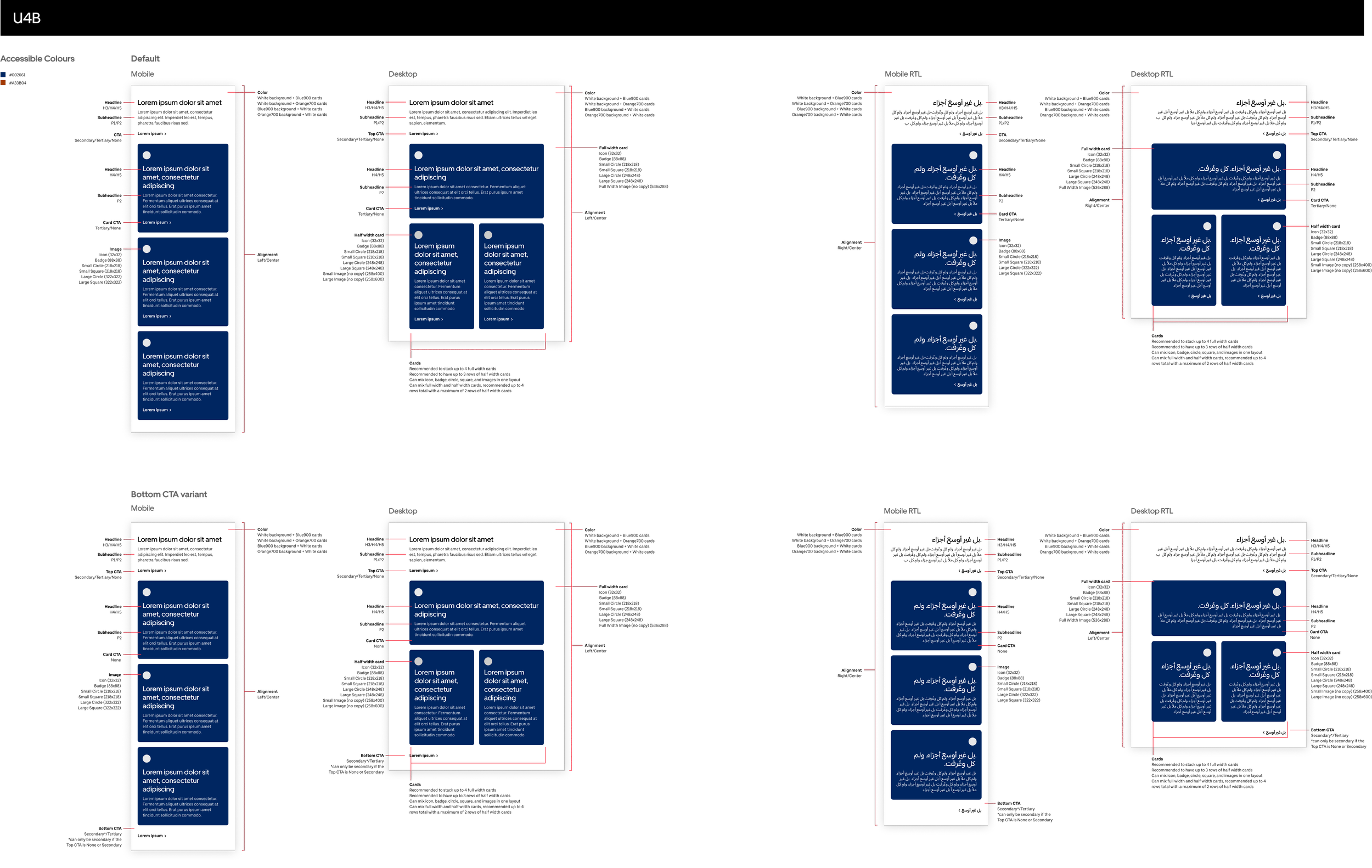 At this stage, we made a new small component library with updated specs to streamline the process of creating every version. We did this to make sure all the cards work and look good together. We also used this step to iron out little details, such as making the small image size 218x218px instead of 248x248px. We also wrote out the rules and details for each card and module, such as what size text is allowed and what call to action button style we can use. In total, we created over 250 versions of the module to show the different possibilities with the seven different image options. We also built each module with left-to-right text and right-to-left text in both black and white.