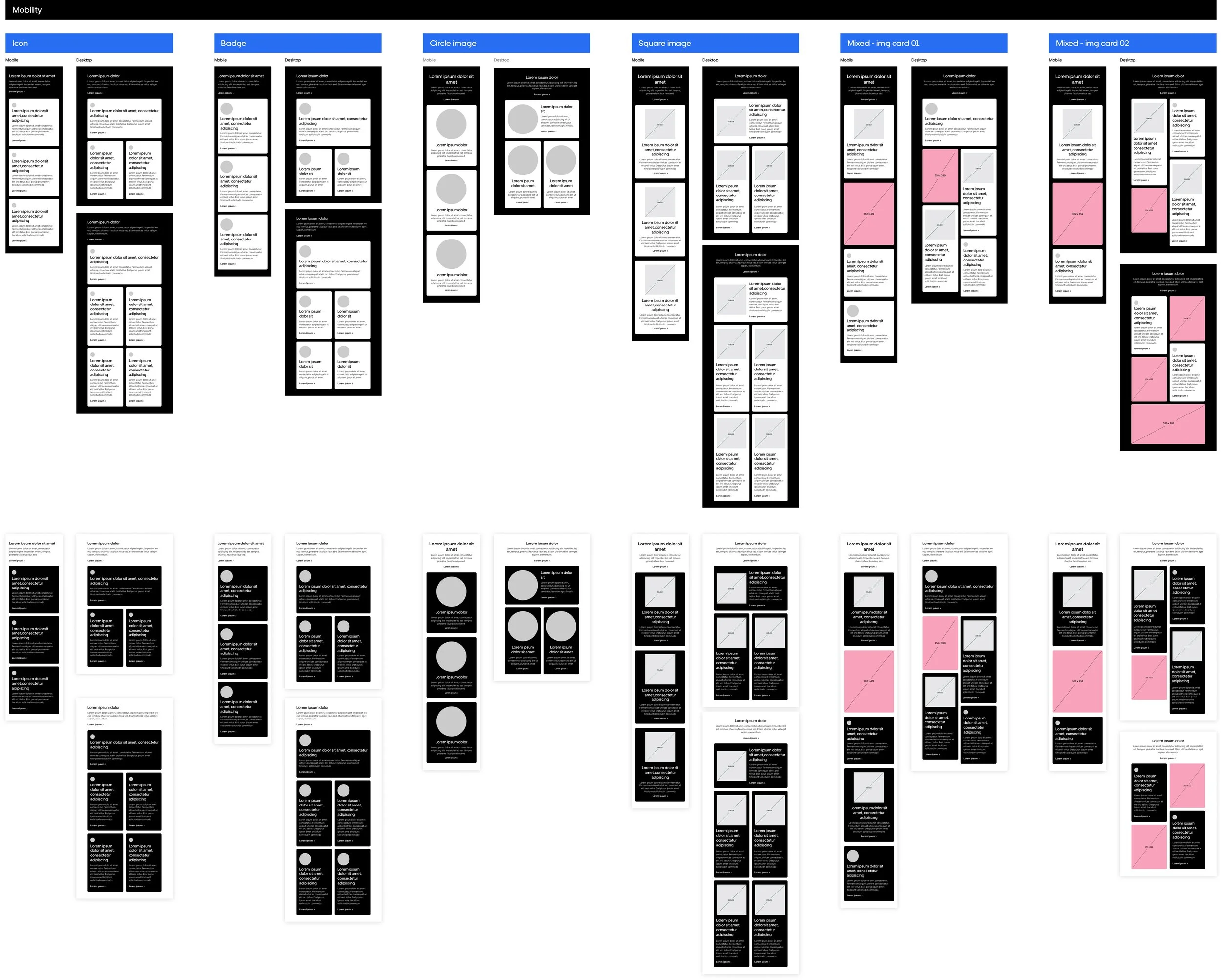 We then began to build initial wireframes. We created versions of mobile width, desktop half width, and desktop full width cards. All sizes were built with small icons, large icons, circle images, square images, and full card images. To make this step and next one easier, we created a small component library with each of the cards so we could quickly make each iteration of the module by changing the card variant.
